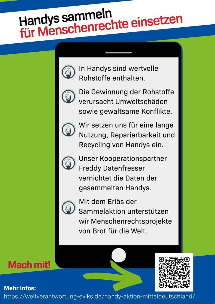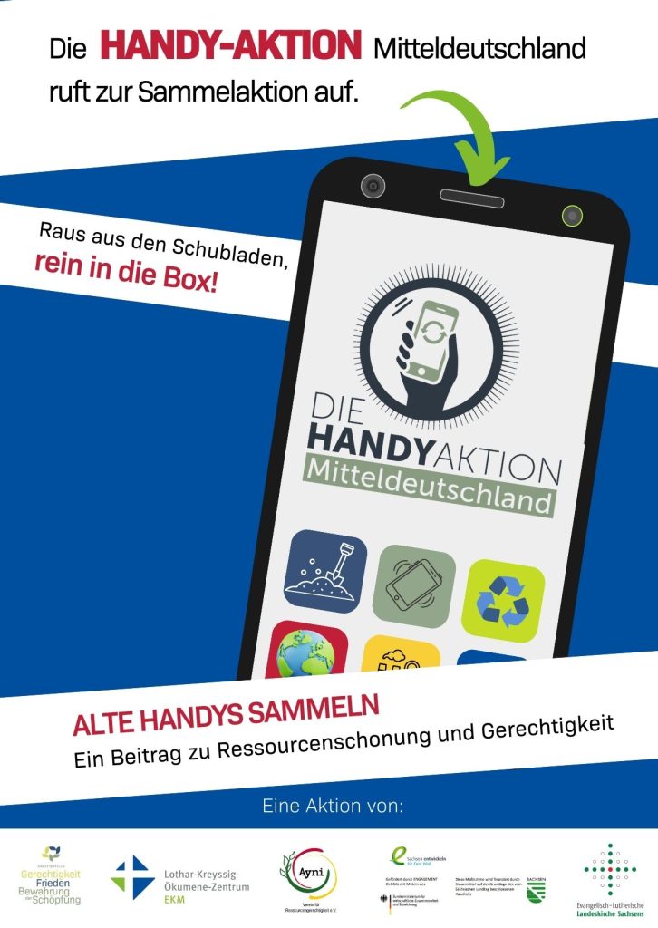 Zugegeben: Diese konkrete Aufforderung Jesu bezieht sich nicht auf Handys, sondern auf Brote. Aber es wird deutlich, dass Jesus Wert auf einen verantwortungsvollen Umgang mit Ressourcen legt. An anderen Stellen der Bibel wird betont, dass soziale Missstände nicht hinnehmbar sind. Deswegen koordinieren wir von der Arbeitsstelle Gerechtigkeit, Frieden, Bewahrung der Schöpfung der Evangelisch-Lutherischen Landeskirche Sachsens, dem Lothar-Kreyssig Ökumenezentrum der Evangelischen Kirche Mitteldeutschland sowie dem Ayni – Verein für Ressourcengerechtigkeit e. V. in Kooperation mit Freddy Datenfresser die Handy-Aktion Mitteldeutschland.